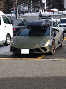 みつまたスキー場の駐車場でランボルギーニウラカンを発見!カスタマイズしてあるから4,000万円くらいか。ランボルギーニがスタッドレスタイヤとルーフキャリアが積めることを初めて知った。ちなみに相模ナンバーだった。